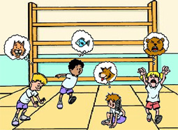 Descripción: los alumnos se desplazan por todo el gimnasio (bosque), en el cual hay distribuidos diferentes materiales (bancos suecos, ladrillos de colores, bancos suecos apoyados al revés, colchonetas....), imitando a un animal (serpiente, canguro, león...), cuando el profesor diga "estatua se deben subir" de la forma que diga el profesor, apoyando una pierna como los flamencos, de puntillas para ser tan alto como las jirafas, con los dos pies y dos manos apoyados como los perros....
